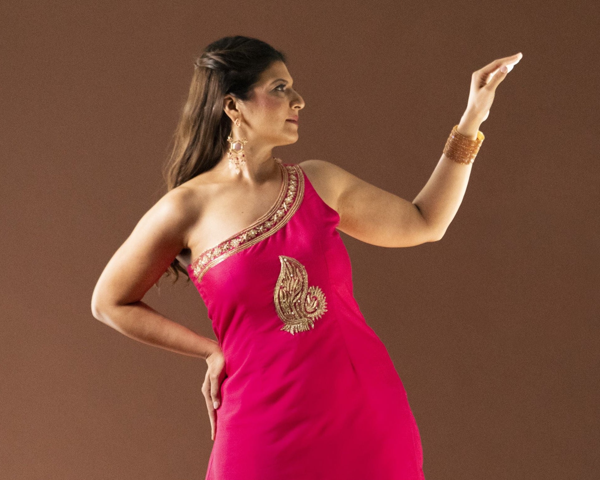 One Shoulder Kurta and Palazzo Pants with Peacock Motif (Rani Pink)